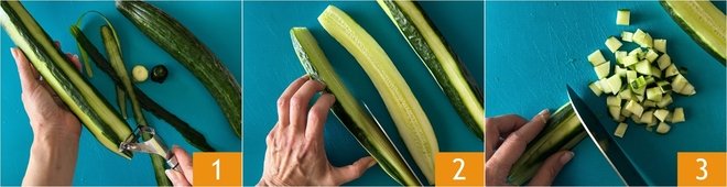 To make Shirazi salad, first prepare the vegetables: trim the cucumbers, then peel them in alternating strips with a vegetable peeler 1. Cut them in half lengthwise 2 and remove the central seeds, then dice them into fairly small cubes 3.