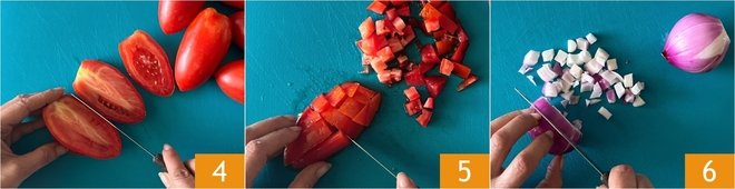 Cut the tomatoes in half as well 4 and dice them after removing the seeds 5. Peel and dice the onion as well 6.