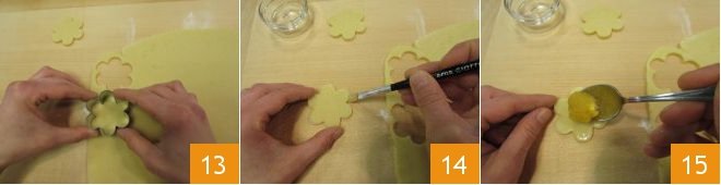 then continue this way until you have 60 flowers 13. You can knead the leftover dough and continue to use it. Take one of the flowers, brush the perimeter with a brush dipped in water 14. Place half a teaspoon of pineapple jam in the center 15