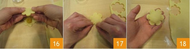 Cover with a second flower 16 and apply slight pressure on the edges 17 to seal them well 18.