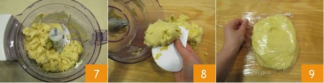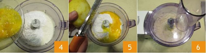 along with the lightly beaten egg 4 and the grated lemon zest 5. Pulse the food processor again for a few moments, this time lowering the speed so the blades mix the dough without blending 8.
