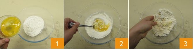 To prepare shrimp and lemon ravioli, first make the fresh pasta dough. In a bowl, pour the flour, add the lightly beaten eggs 1, and start incorporating them with a fork. Then work the mixture with your hands 3,