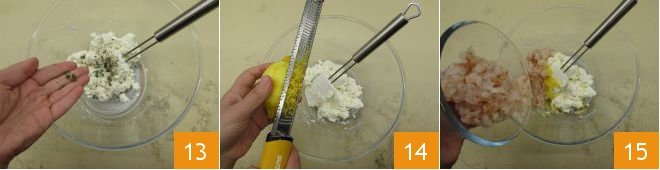 Coarsely chop the shrimp (10-11). In a bowl, work the ricotta together with salt and pepper 12.