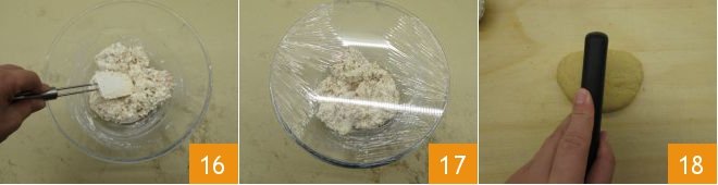 Mix to combine all the ingredients 16, cover with plastic wrap 17, and transfer to the refrigerator. Once the dough has rested, take a piece 18, making sure to cover the remaining part with the plastic wrap to prevent it from drying out.