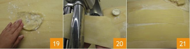 Flatten it slightly with your hands using a bit of flour 19, then roll it out using a pasta machine, gradually reducing the roller thickness until you get a rectangular sheet about 1/8 inch thick 20. Repeat the same operation to obtain two sheets of the same size 21.