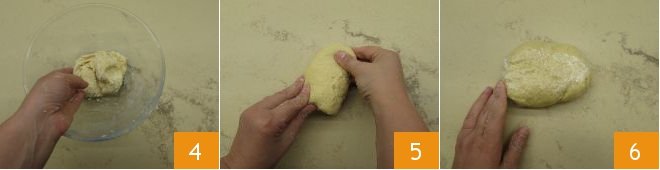 until you have a uniform dough ball 4. Transfer it to a work surface and knead for about 5 minutes 5; wrap the obtained dough in plastic wrap 6 and let it rest for at least 30 minutes at room temperature.
