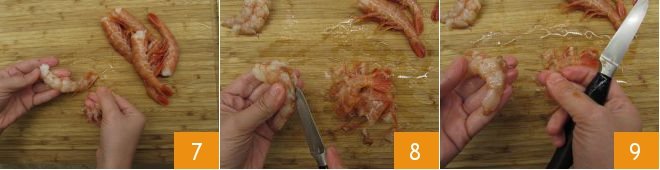 In the meantime, clean the shrimp tails. Remove the shell by pulling it off with your hands 7, then cut along the back of each shrimp 8 and gently remove the black vein 9.