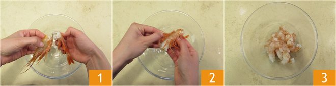To prepare the shrimp and watermelon tartare, start by cleaning the shrimp: remove the head 1 and the shell 2. Collect the flesh in a bowl 3.