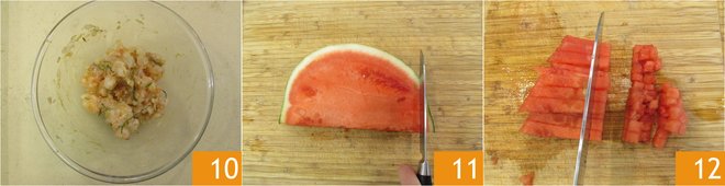 Mix to season 10. Store the shrimp in the refrigerator to marinate; in the meantime, prepare the watermelon: slice it into approximately 1/4-inch slices, remove the rind 11, and then cut into approximately 1/4-inch cubes 12.