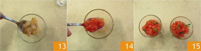 Now assemble your glasses: place the shrimp tartare at the base of the glass 13, lay the watermelon on top 14, and garnish with mint and basil leaves; serve the shrimp and watermelon tartare immediately 15.