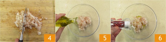 Coarsely chop the shrimp 4, place them in a bowl, and season with oil 5, salt, and pink pepper 6.
