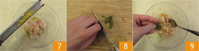 Flavor with lemon zest 7, chop basil and mint 8, and add them to the tartare 9.