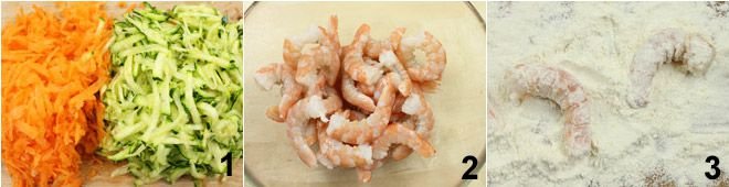 To prepare the shrimp skewers, start by washing the zucchini well, remove the ends, and cut them into julienne strips. Peel the carrots and also cut them into julienne strips 1, then leave them in a colander to drain excess water. Shell the shrimp 2 and after coating them in flour 3, thread them onto wooden skewers.