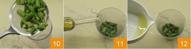 After cooking, the asparagus should be tender, drain them and pour them into a tall glass 10. Season with oil 11, salt, pepper, some marjoram leaves, lemon juice 12, and zest.