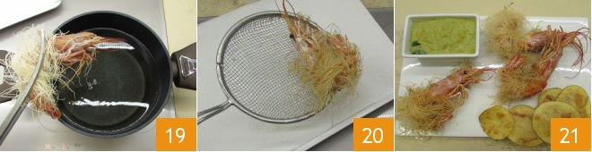 Now it's the turn of the shrimps, immerse them in the oil a few at a time 19, fry them until golden, it will take a couple of minutes, then drain them on paper towels 20. Serve the shrimps in kataifi pastry with asparagus sauce immediately 21.