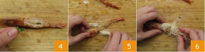 Now season with marjoram leaves 4 and wrap the shrimps with kataifi pastry (5-6). Be careful to gently unravel the pastry and always keep it on a damp cloth to prevent it from drying out.