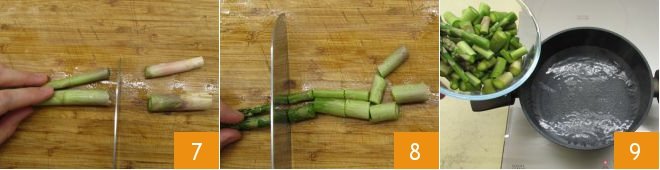 Proceed with the cream: take the washed and dried asparagus, then remove the tougher white part 7 and cut the rest into pieces 8. Boil the asparagus in hot water for 10 minutes 9.