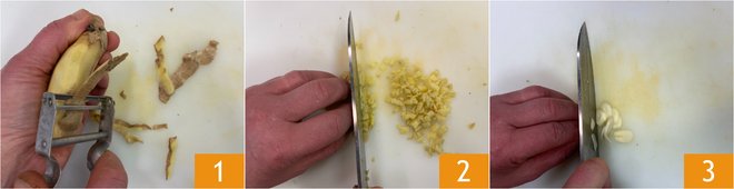 To prepare Sichuan pepper beef, first peel the ginger 1 and finely chop it with a knife 2. Peel and slice the garlic 3.