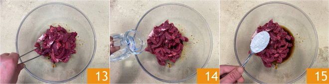 Mix well 13 so that the meat is evenly coated by the marinade. Finally, pour in the water 14, the potato starch 15, and mix again.