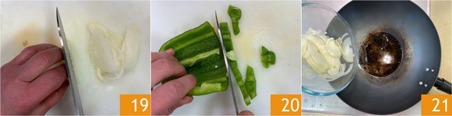 Meanwhile, clean and slice the onion 19 and pepper into strips 20. In the wok, pour the peanut oil and heat it well. Then add the onion 21 and sauté for 3-4 minutes over high heat.