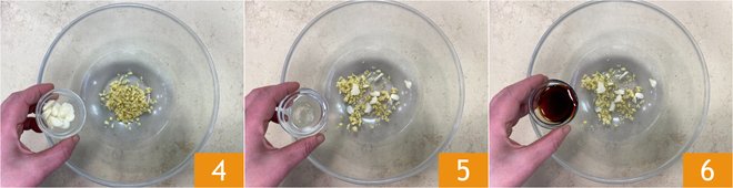 In a bowl, place the ginger and garlic 4, then add the rice wine 5 and the soy sauce 6.