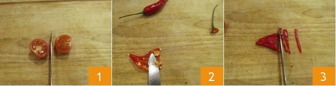 To make Sicilian-style chicken, wash and dry the cherry tomatoes, then cut them in half 1 and set them aside. Remove the center of the chili peppers, cut them to extract the seeds 2, then slice them thinly 3.
