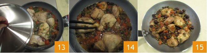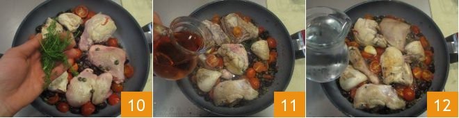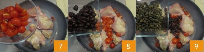 Brown the chicken pieces 2-3 minutes per side over medium heat, then pour in the cherry tomatoes 7, olives 8, and capers 9,