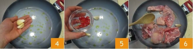 Heat the olive oil in a pan, add the two garlic cloves 4 and chili peppers 5 and brown for a couple of minutes, then add the chicken 6.