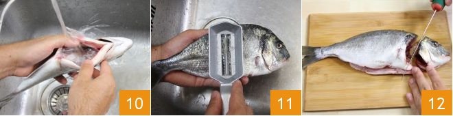 Rinse the fish thoroughly inside and out 10. Remove the fins with scissors. Then place the sea bream under running water and start scaling it with a special tool (or by rubbing the blade of a knife) from the tail to the head of the fish 11. Repeat the process until you have removed all the scales. Then remove the gills and cut the head off 12.