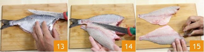 Then, fillet the sea bream: make an incision along the back and cut deeply, working with the blade horizontally compared to the work surface 13 so you can separate the meat from the bone 14 and obtain the first fillet. Flip the sea bream and repeat the operation, detaching the meat from the bone to get the second fillet. Remove any remaining bones with tweezers 15. Proceed with the second sea bream to obtain more fillets and pat them lightly with paper towels to dry excess liquids.