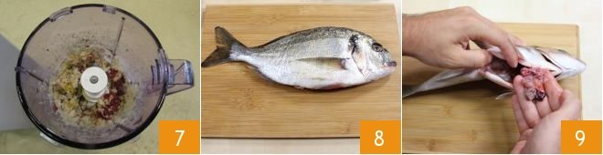 Activate the blender and blend the ingredients until you get a smooth cream 7, then set the cream aside. Next, focus on the cleaning of the sea bream 8. Make a cut along the belly of the fish from the tail to the head using scissors and remove the internal organs 9.