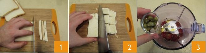 To prepare the Sicilian-style sea bream sandwiches, start with the filling: take the bread, cut off the crusts 1, and divide the slices into small squares 2. Then, take a blender, add the sun-dried tomatoes and capers 3.