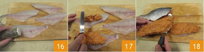 Adjust with salt and pepper 16. Use a spatula to spread the Sicilian sauce over each fillet, covering the entire surface (17-18).