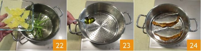 Place one fillet on top of the other, so that the part with the seasoning matches: this way, you'll get two sea bream sandwiches 19. Set aside. Take a large steamer pot, fill it halfway with water so that when you place the basket, the water does not touch the surface. Add the black peppercorns 20 and parsley stems 21.