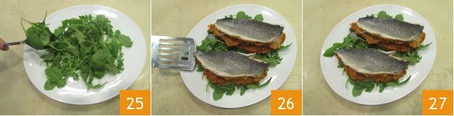 Meanwhile, take a plate and place the previously washed and dried arugula on it 25; using a kitchen spatula, transfer the cooked sea bream sandwiches onto the arugula bed 26. Now your sandwiches, still warm, are ready to be served 27. If you prefer, you can add olive tapenade to the filling and dress with a drizzle of extra virgin olive oil!