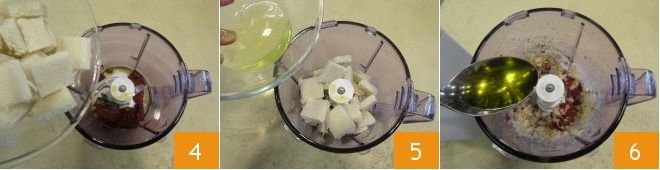 Add in the bread squares 4, then the egg whites 5 and the extra virgin olive oil 6.