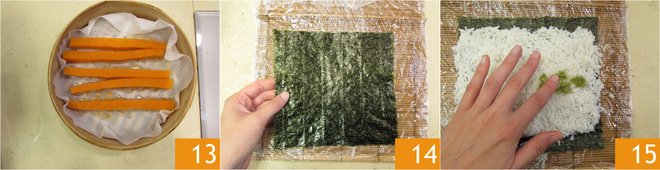 Once cooked, let the pumpkin cool 13. At this point, place the seaweed on the special sushi mat 14 and lay the rice on top, making sure to reach the edge of the short side and leaving about 0.4 inches of space from both long sides, flattening it well with your hands. In the center, spread a strip of wasabi with your finger 15.
