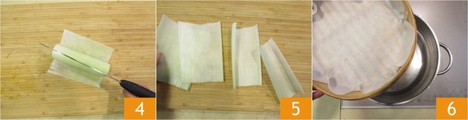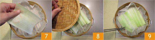 Cut the leek lengthwise with a knife 4 and peel it 5. Prepare a steamer with a basket lined with parchment paper 6.