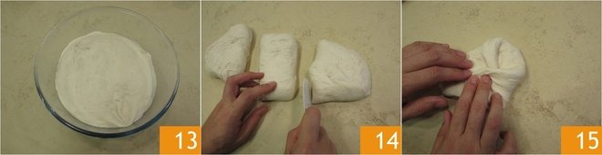 After the rising time, the dough will be beautifully swollen 13, then transfer it to the work surface and divide it with a scraper into 3 pieces of 9.35 oz 14. If needed, you can lightly flour the work surface. Now take each portion and, as done before, lift a flap of dough and bring it towards the center. Repeat the same operation for the other 3 flaps of dough 15.