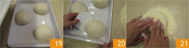 Turn the dough over and proceed with pirlatura: pirlare the dough means rotating it with your hands on the work surface, bringing it towards you and then pushing it away repeatedly until you get a smooth and regular sphere 17. Gradually transfer the dough pieces into a pizza box previously greased 17 and cover with its lid 18.