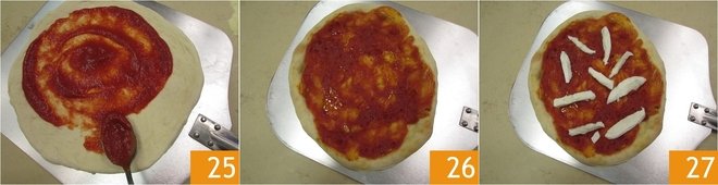 Now, with the help of a spoon, spread the tomato puree on the pizza, leaving the edge free 25. Bake, letting the pizza slide gently onto the pizza stone and let it cook for about 6 minutes. Meanwhile, cut the mozzarella into sticks 26 or shred it with your hands. You can squeeze it gently so it doesn't release too much water during cooking 26. After 6 minutes, always using the paddle, remove the pizza from the oven 27.