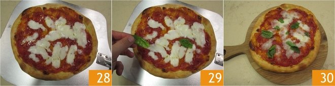 Place the mozzarella sticks on top 28 and bake for another 6 minutes or so. When the pizza is well browned, remove it from the oven, add the basil leaves 29, and if you like, a drizzle of oil and serve. Cook the other two pizzas in the same way and enjoy your simple Margherita pizza piping hot 30!