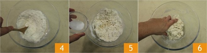 Mix gradually with a wooden spoon 4 and when you have added almost all the water, add the salt as well 5. Continue to pour the water and start kneading with your hands to mix the ingredients together 6.