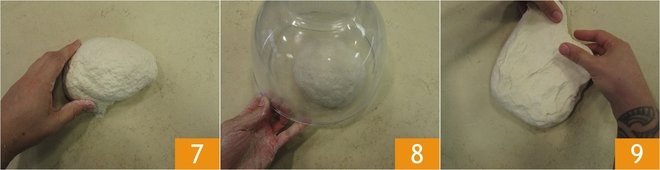 Once you have made the 4 folds by turning it over itself 10, shape it into a sphere 11. Transfer the formed dough into a bowl, cover with plastic wrap, and let it rise 12. For convenience, you can put the bowl in a turned-off oven with the light on, so the inside reaches a temperature of 79°F-82°F, ideal for rising; alternatively, you can also keep the bowl in a warm place. The times are approximate as every dough, temperature, and weather conditions affect rising: on average, the dough should take 6 hours to double in volume.