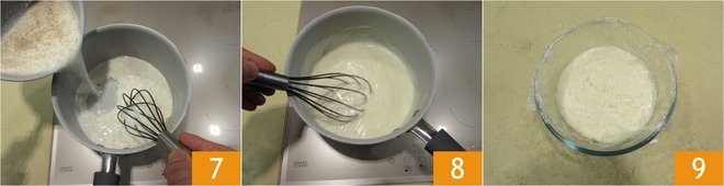 Pour the warm milk in a thin stream and start cooking the béchamel sauce, stirring with a whisk 7. Continue thickening until the béchamel sauce reaches just below boiling point 8. Once thickened, transfer it to a bowl covered with plastic wrap 9.