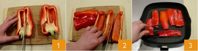 To prepare the smoked scamorza and bacon skewers, start with the pepper: wash it, then cut it in half and remove the top and seeds 1; then cut it into strips 2 and grill it on a hot cast iron griddle on both sides 3.