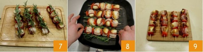 until you have 4 scamorza bites and 4 pieces of red pepper on the skewer. Pair each skewer with a sprig of rosemary 7; then heat the cast iron griddle and brown the skewers for about 10 minutes, turning them often, but making sure the side with the wrapped bacon, not the scamorza, is in contact with the griddle 8. As soon as the bacon is golden, remove the skewers from the griddle and serve immediately 9!