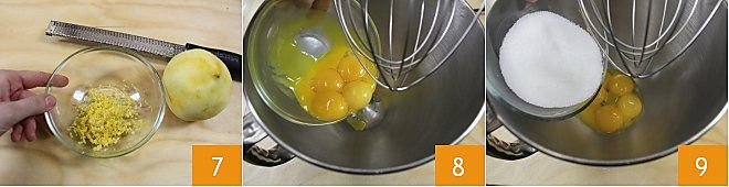 In the meantime, prepare the cream: grate the zest of a lemon and set it aside in a small bowl 7. Then separate the egg yolks from the whites, place them into the bowl of a stand mixer 8, add the sugar 9, and whisk until you obtain a light and frothy mixture. If you don't have a stand mixer, you can use an electric hand mixer or a whisk.