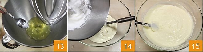 At this point, sieve the ricotta you had set to drain, using the back of a spoon 10, and add it to the frothy mixture 11. Finally, add the grated lemon zest you set aside 12, mix, and transfer everything to a bowl. Remember not to mix for too long, otherwise, you will whip the ricotta.