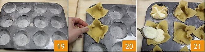After buttering the tin, lightly dust it with flour 19, and start placing the dough squares into the spaces, ensuring to leave the edges out 20. Then, pour about 1/4 cup of cream into each dough square 21.
